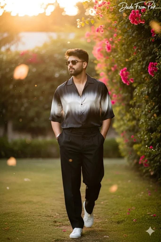 Ultra-realistic 9:16 cinematic portrait of a 5’10” stylish young Pakistani man (100% face match). Captured mid-step on a sunlit path blending lush greenery and vibrant pink bougainvillea, casual yet sophisticated, both hands in pockets, exuding effortless style. Outfit: flowing black-and-white gradient half-sleeve shirt with subtle silk-like sheen, loose-fitting tailored pants with natural folds, crisp white sneakers, and a sleek silver bracelet. Sunglasses reflect golden sunlight, hair naturally tousled, slight side-glance with a calm, romantic, editorial expression.