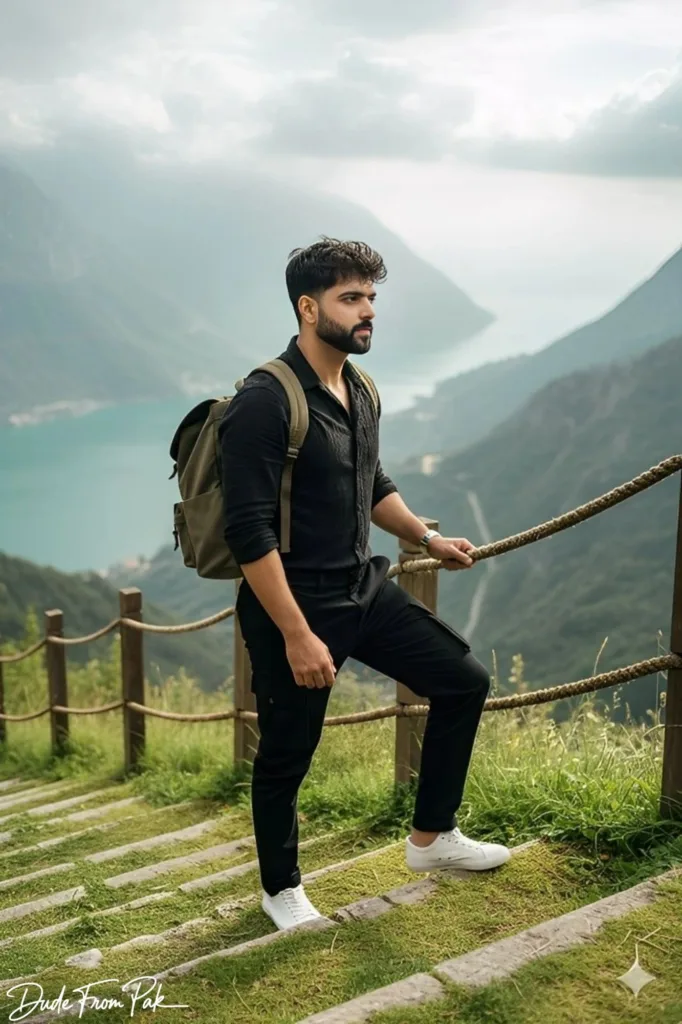 Ultra-detailed, hyper-realistic 9:16 portrait of a 29-year-old handsome man, identical to the reference face, hair, and features. He stands on white moss-covered limestone stairs with a rustic wooden rope railing, overlooking a turquoise-green mountainous valley with soft morning mist. Outfit: black peach shirt, tailored black cargo pants, crisp white canvas shoes, olive-green backpack. Pose: calm and reflective, gazing toward the distant sea, one foot on a higher step, one hand resting on thigh, the other gripping the rope railing.