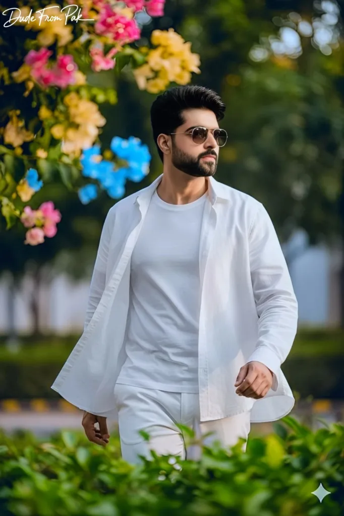 Ultra-realistic 9:16 cinematic outdoor portrait of a 5’10”, 29-year-old stylish Pakistani man (100% face match). Slightly messy hairstyle, wearing reflective sunglasses. Outfit: layered all-white ensemble — loose white linen shirt over a fitted white t-shirt, relaxed white trousers with natural folds, and a lightweight white jacket open or casually draped. Subtle fabric textures and soft layering add depth and realism. Shirt and jacket gently move with a soft breeze, creating natural motion. He gazes thoughtfully off-camera, captured in a spontaneous, editorial-style moment.