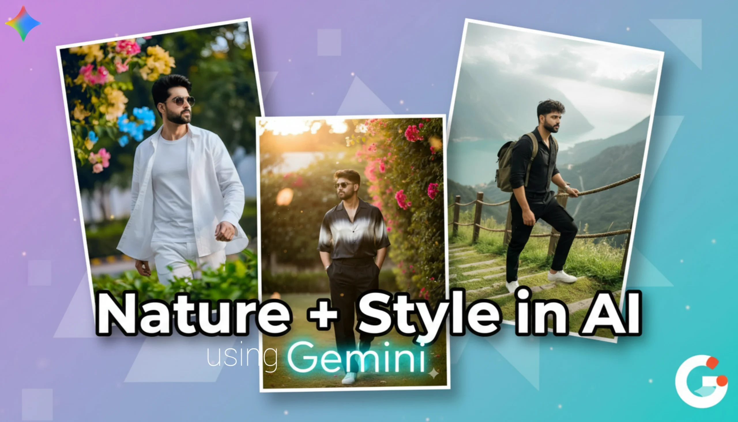 Foreground and framing: soft-focus bougainvillea flowers in muted pink, warm yellow, and soft blue in the upper left corner, heavily blurred lush green leaves in the extreme foreground. Depth of field: natural soft bokeh, golden-hour sunlight filtering through foliage, casting gentle highlights and shadows on his face, layered outfit, and surroundings. Cinematic composition: eye-level framing, slight motion blur on clothing for realism, ultra-sharp focus on the subject, hyper-real textures on fabric, skin, and foliage. Color grading: natural, true-to-life modern palette — crisp whites, balanced greens, soft floral hues, and warm sunlight tones. Captures a luxurious, stylish, and lifelike outdoor editorial moment, perfect for magazine-quality fashion imagery.
