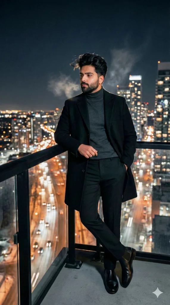 He wears a black wool overcoat layered over a fitted charcoal turtleneck, tailored black trousers, and polished leather Chelsea boots.