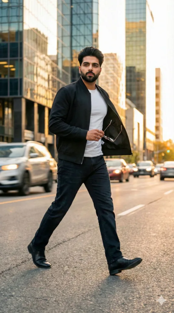He wears a tailored black bomber jacket, white fitted tee, dark straight jeans, sunglasses in hand — not worn.