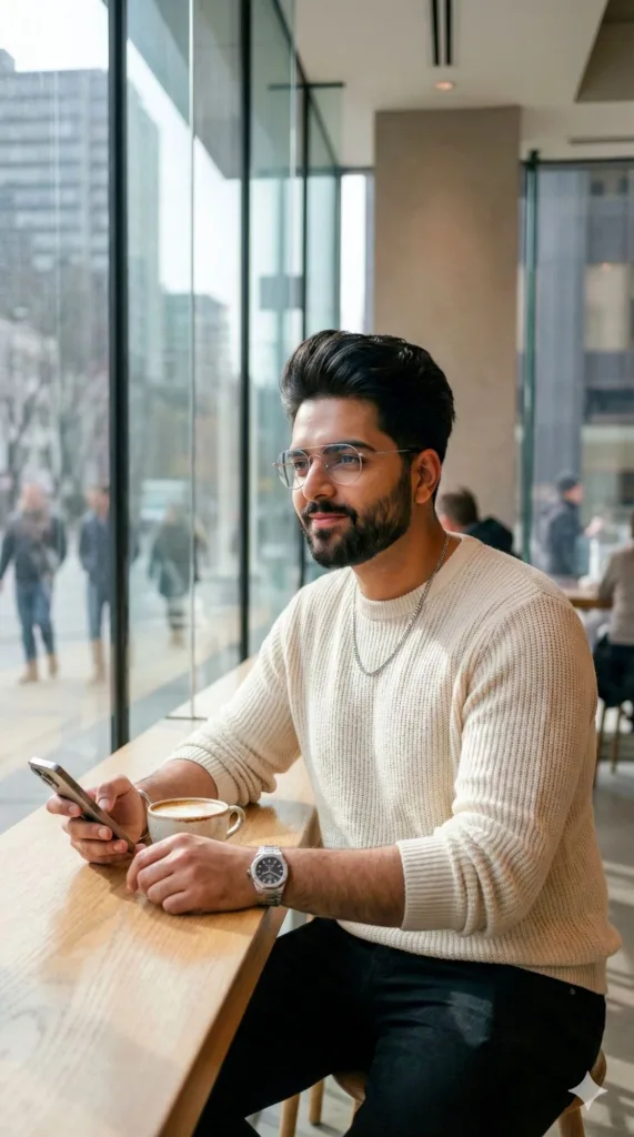 He wears a cream knit sweater, silver chain, slim black trousers, sleeves slightly pushed up, revealing a steel watch.