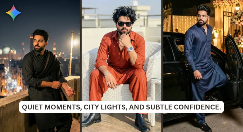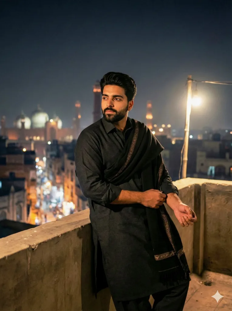 Night has fallen. City lights glow below—yellow windows, distant mosques, faint azaan somewhere in the air. He leans against the low parapet, deep charcoal shalwar kameez, sleeves rolled once, thick winter fabric keeping him grounded. Wool shawl draped over one shoulder, catching faint rooftop light. Eyes not looking at the camera, staring somewhere else—maybe thinking, maybe just taking it all in. Soft side light, gentle rim light, shadows falling naturally. Cold air brushing past. Heavy. Quiet. Free. You notice it because it’s real, not staged.