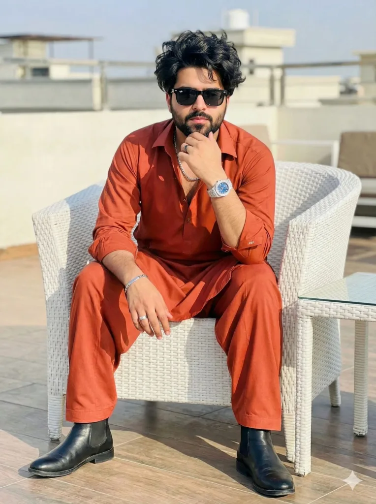 He’s sitting on a white woven chair. Burnt orange shalwar kameez, two buttons open. Necklace dangling, just enough to catch the eye. Black Chelsea boots on the floor, watch glinting quietly, bracelet and ring in place. Hair messy, but like he meant it, beard neatly trimmed. Right hand near chin, maybe thinking, maybe resting doesn’t really matter. Small white side table to one side, wind brushing softly. For a moment, it feels like time paused. Just him and the air. Quiet. Unbothered.