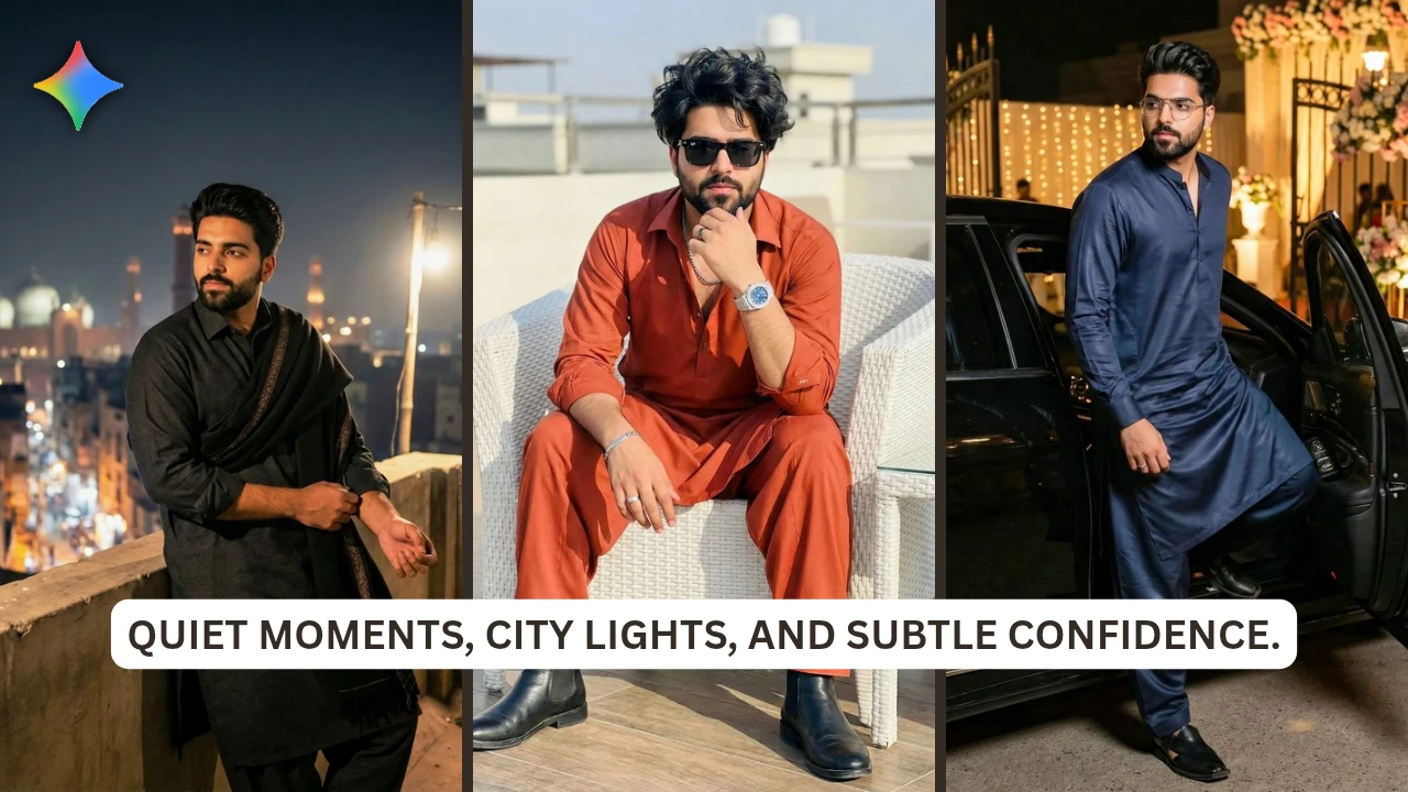 Night has fallen. City lights glow below—yellow windows, distant mosques, faint azaan somewhere in the air. He leans against the low parapet, deep charcoal shalwar kameez, sleeves rolled once, thick winter fabric keeping him grounded. Wool shawl draped over one shoulder, catching faint rooftop light. Eyes not looking at the camera, staring somewhere else—maybe thinking, maybe just taking it all in. Soft side light, gentle rim light, shadows falling naturally. Cold air brushing past. Heavy. Quiet. Free. You notice it because it’s real, not staged.