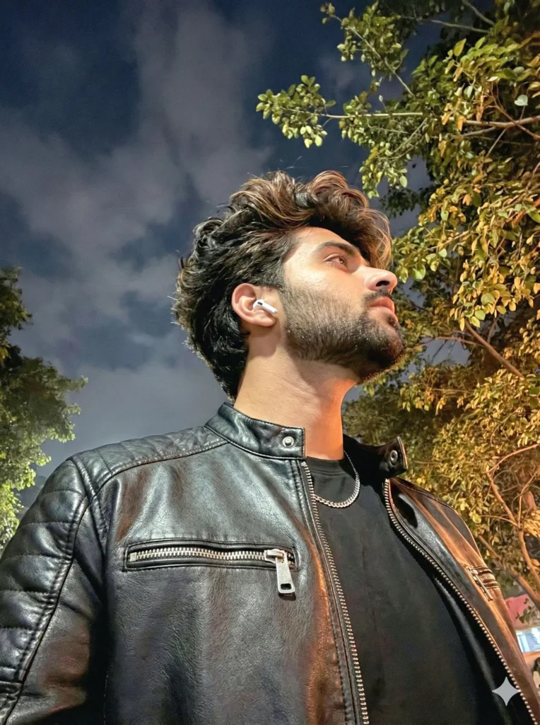 The leather biker jacket does heavy narrative lifting here. It’s detailed, worn-in, functional not decorative. The open zip, black t-shirt, and exposed silver chain introduce vulnerability without trying to make it sentimental. Even the white earbud plays a role: he’s listening to something private while standing in a public space.