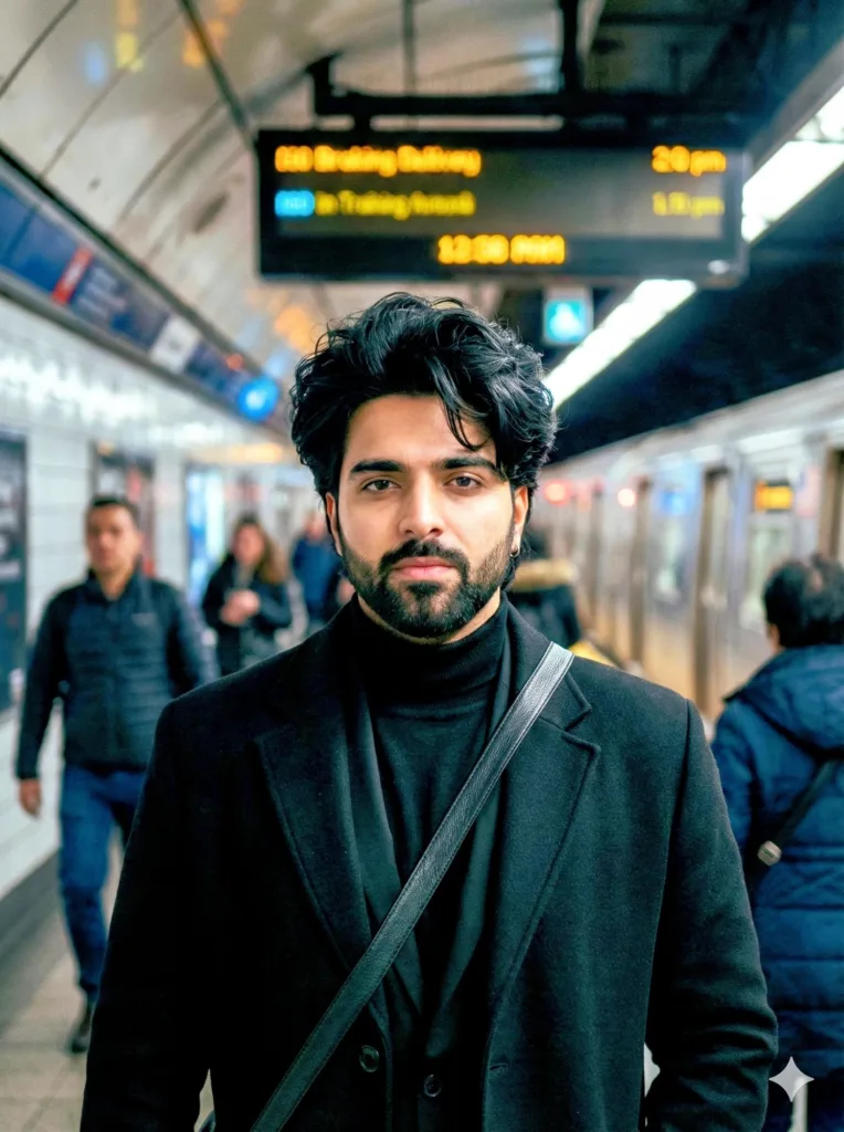Ultra-realistic cinematic portrait of the same man from the reference image standing inside an underground subway station.