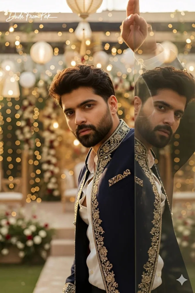 Ultra-realistic, cinematic close-up portrait of a man, turned slightly, gazing intensely at the camera. Reflection subtly visible on a polished glass surface to the right, revealing his profile. Right arm raised, hand out of frame, forming a strong diagonal. Wearing a deep navy or charcoal Pakistani sherwani-inspired jacket with intricate embroidery, layered over a crisp white shirt.