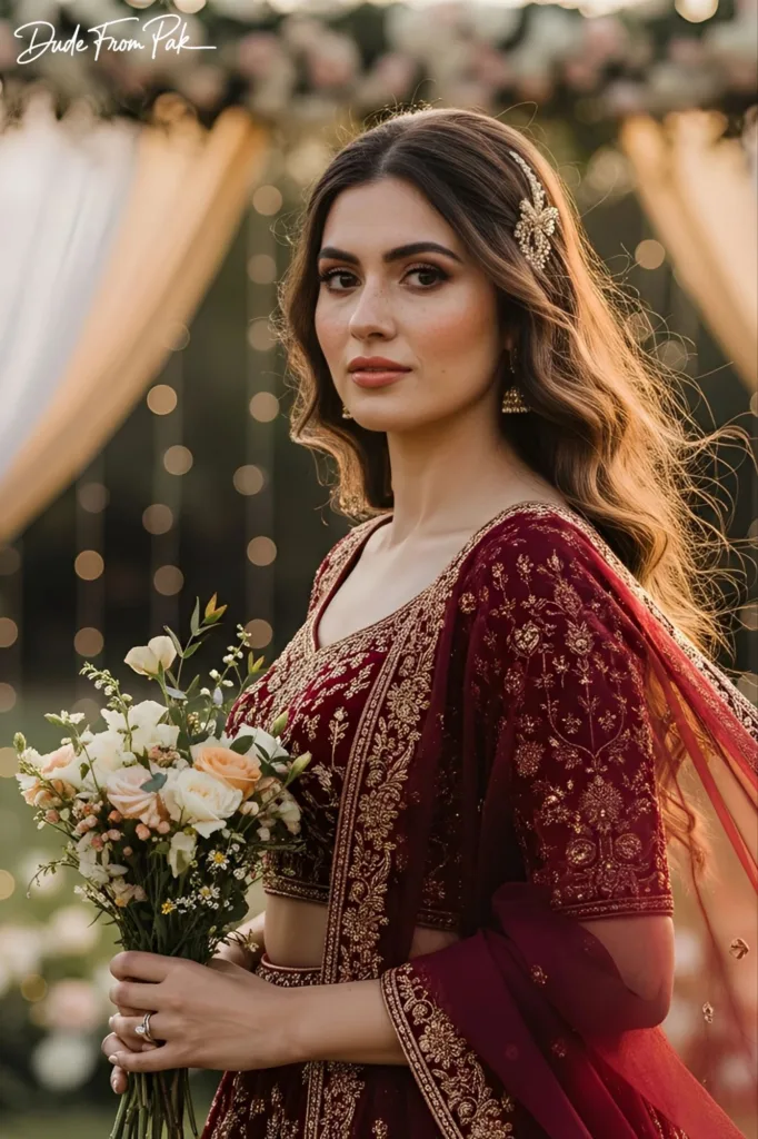 Ultra-realistic, cinematic dose-up portrait of a bride, slightly turning toward the camera with an intimate gaze. Wearing a deep maroon or wine-red heavily embroidered lehenga with delicate gold threadwork, paired with a matching dupatta draped elegantly over her shoulder. Flowing fabrics subtly move in the breeze, one hand holding a small bouquet of wildflowers. Long hair styled in soft waves with a subtle butterfly or jeweled hair accessory. Natural makeup with peach glossy lips and visible freckles, highlighting her features.