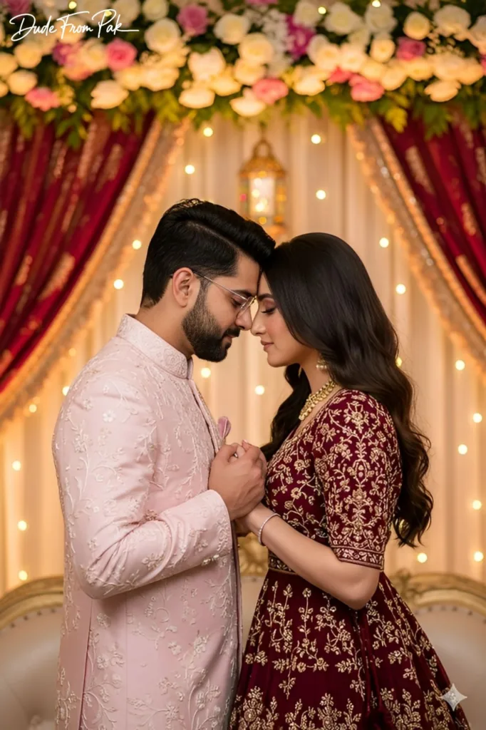 Ultra-realistic, cinematic close-up portrait of a loving couple on a wedding or festival stage. The man wears a sky-pink tailored sherwani-inspired suit with intricate embroidery and soft white and sky-pink formal shoes, paired with stylish glasses. He gently holds his girlfriend's hands, pressing them together in front of her, maintaining a tender, romantic face-to-face gaze. The woman wears a maroon empire waist lehenga or long dress with delicate gold embroidery and subtle traditional embellishments, flowing naturally and elegantly. Their foreheads lightly touch, capturing an intimate, heartfelt moment. The background is a beautifully decorated Pakistani wedding stage with warm golden lighting, fresh floral arrangements, traditional drapery, and subtle festive elements like lanterns or strings of lights, creating depth, warmth, and a realistic festive ambiance. Both faces remain 100% identical to the reference images.